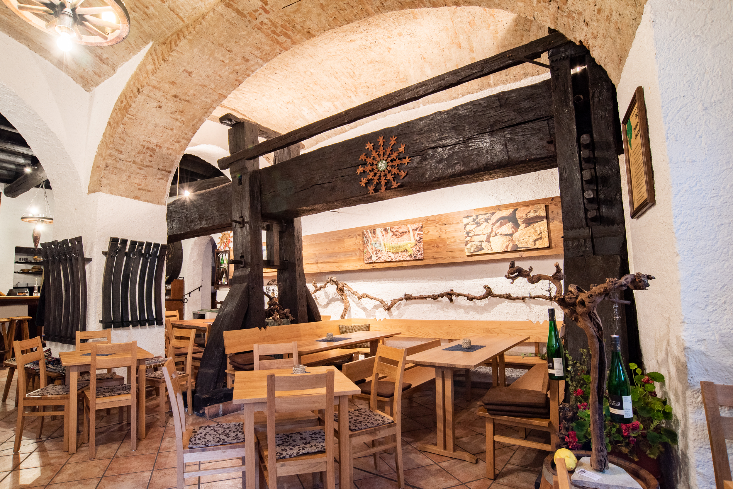 Die alte Baumpresse mit neun Metern Länge und 70 cm Durchmesser ist nicht nur integraler Bestandteil unseres gemütlichen Heurigenlokales, sondern auch ein echtes Stück Geschichte. Wissenschaftlichen Untersuchungen zufolge stammt sie aus dem Jahr 1522 und ist damit vermutlich die älteste Weinpresse im deutschen Sprachraum. Mit Stolz können wir diese Geschichte unseren Gästen erzählen und dass wir bis 1996 die gesamte Weinernte mit genau dieser Presse verarbeitet haben.